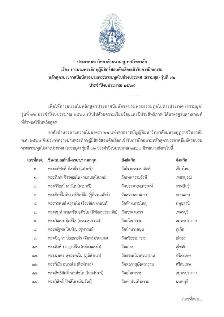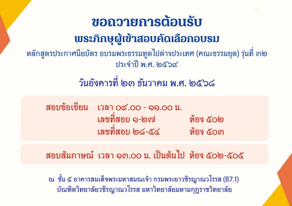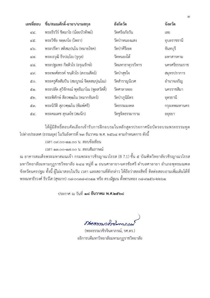 ให้ผู้มีสิทธิ์สอบคัดเลือกเข้ารับการฝึกอบรมในหลักสูตรประกาศนียบัตรอบรมพระธรรมทูตไปต่างประเทศ (ธรรมยุต) ในวันอังคารที่ ๒๓ ธันวาคม พ.ศ. ๒๕๖๘ ตามกำหนดการ ดังนี้
